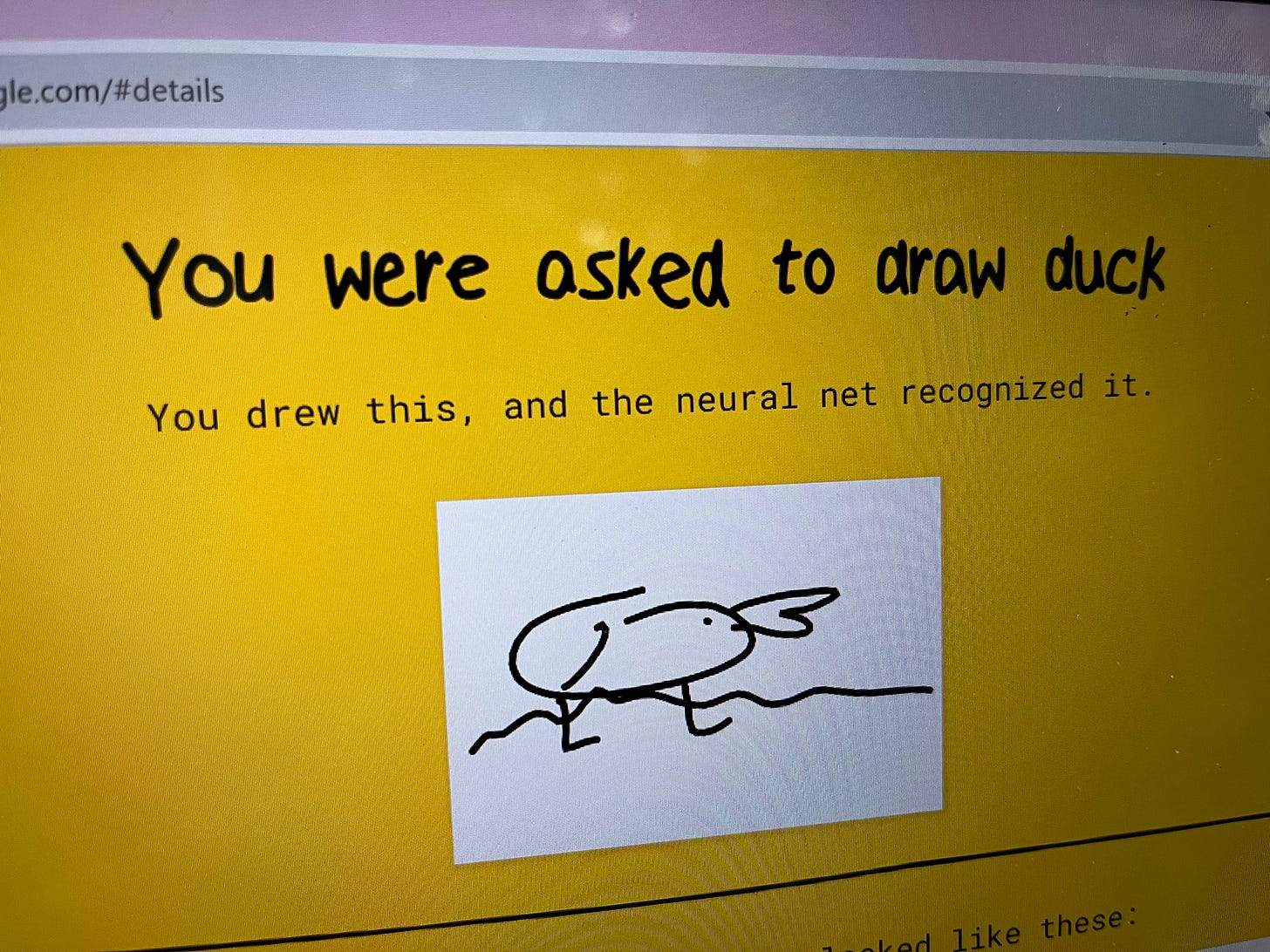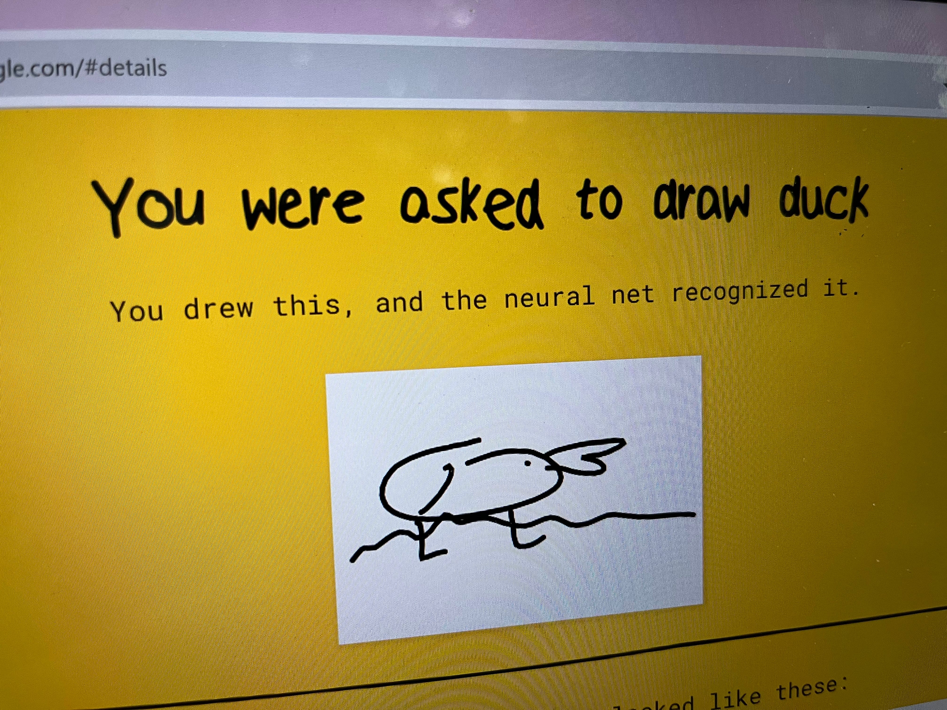 This is the moment that almost broke my beloved wife. What can I say? The world may not recognize my handiwork, but the “neural net” did. (Full disclosure: Heather happens to be an excellent picture drawer, and she routinely kicks my ass at this game.)